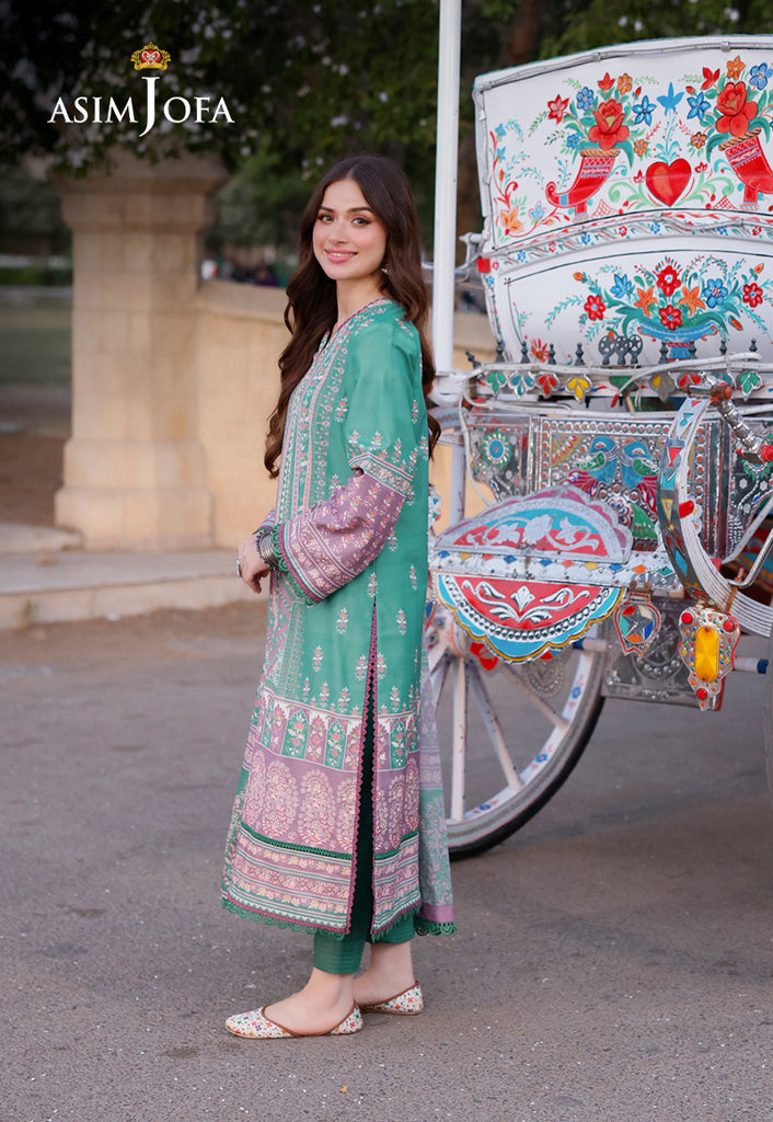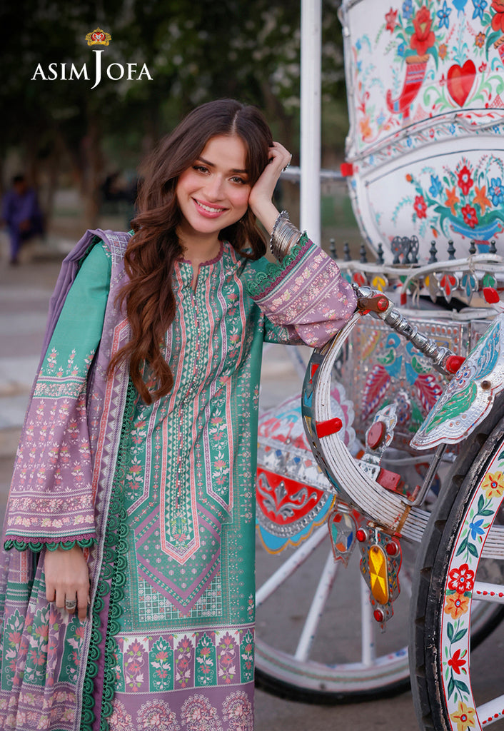 Unveil the serene beauty of summer with Asim Jofa’s “Arabic Lawn Collection”! This teal base adorned with intricate floral and geometric motifs in soft hues of lavender and white. The neckline, borders and sleeves add a touch of elegance. Paired with dupatta that harmonizes with the outfit’s teal and lavender tones, this look exudes a timeless charm. This collection is truly unique with the blend of tradition and modernity in the “Arabic Lawn Collection”.