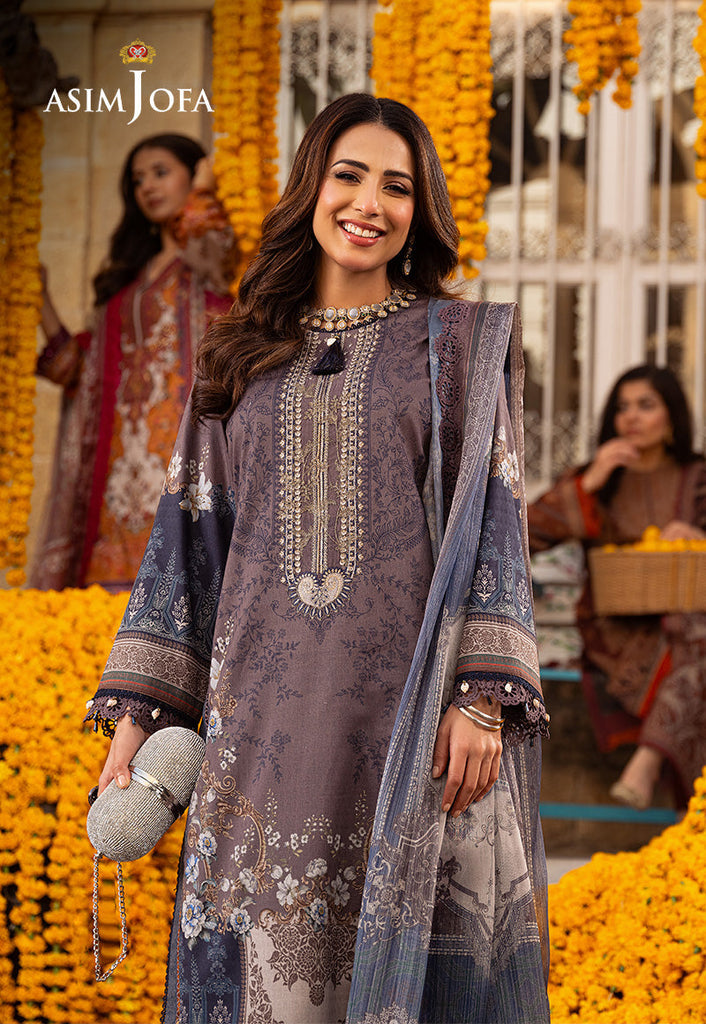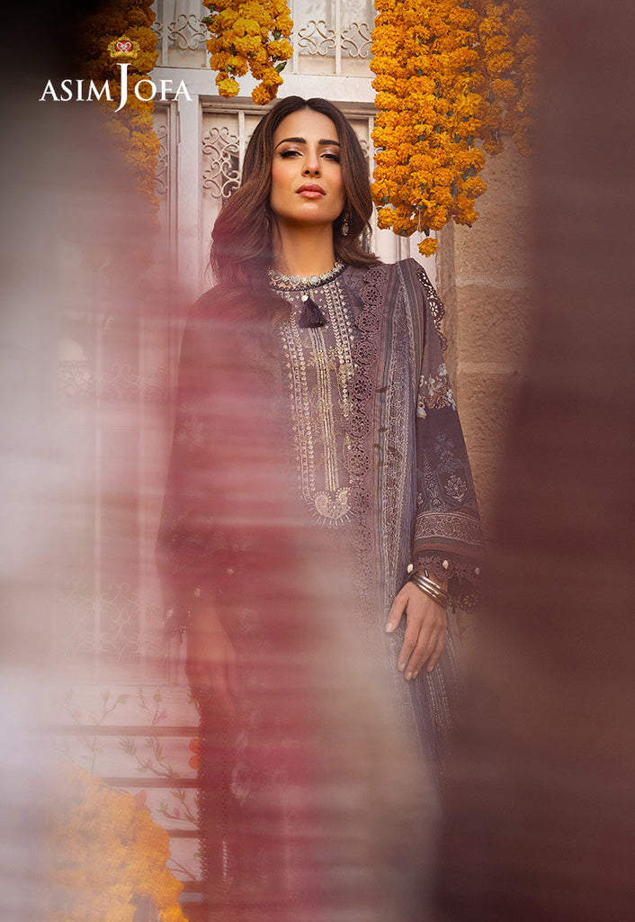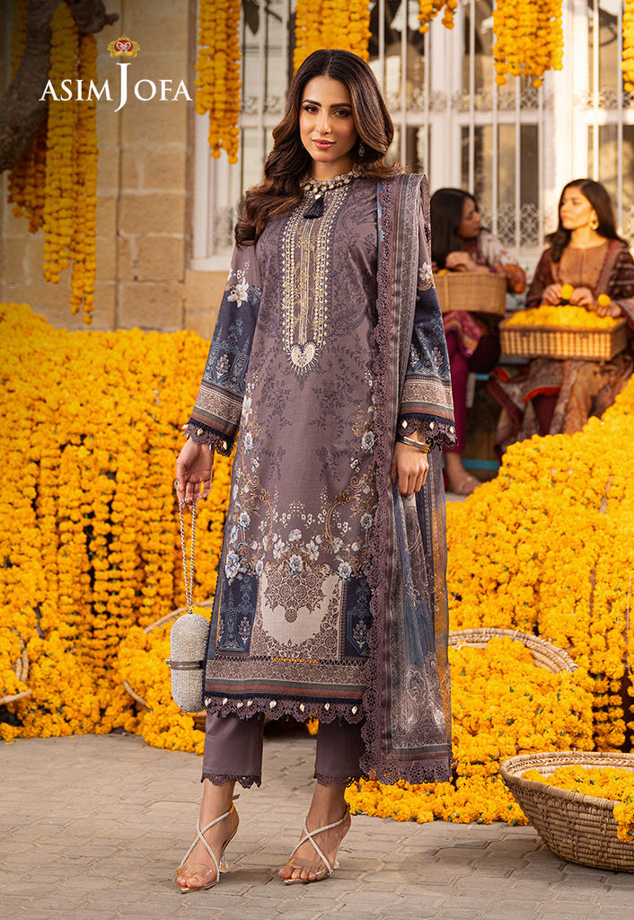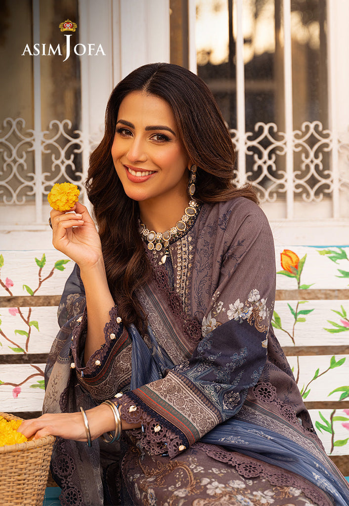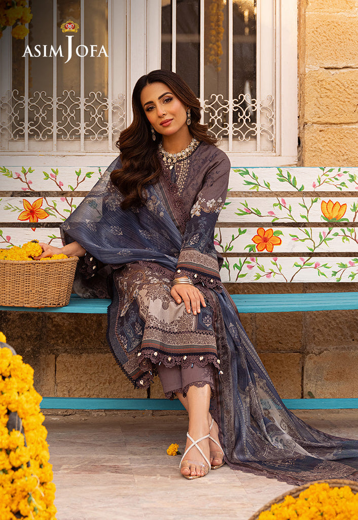 Indulge in understated elegance with this greyish-brown ensemble from Asim Jofa's "Aira – Summer Print Collection". Featuring an embroidered neckline and a digital printed shirt adorned with contemporary motifs, this outfit exudes sophistication and charm. The digital printed silver Mehsuri dupatta adds a touch of shimmer and grace elevating the design to new heights of elegance. As Ushna Shah graces this design, its elegant vibe becomes apparent resonating with modern chic and timeless grace. Whether for a formal occasion or a casual gathering, this outfit promises to make a statement with its understated yet captivating allure.
