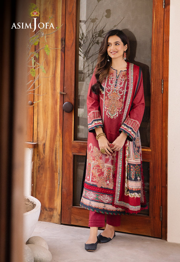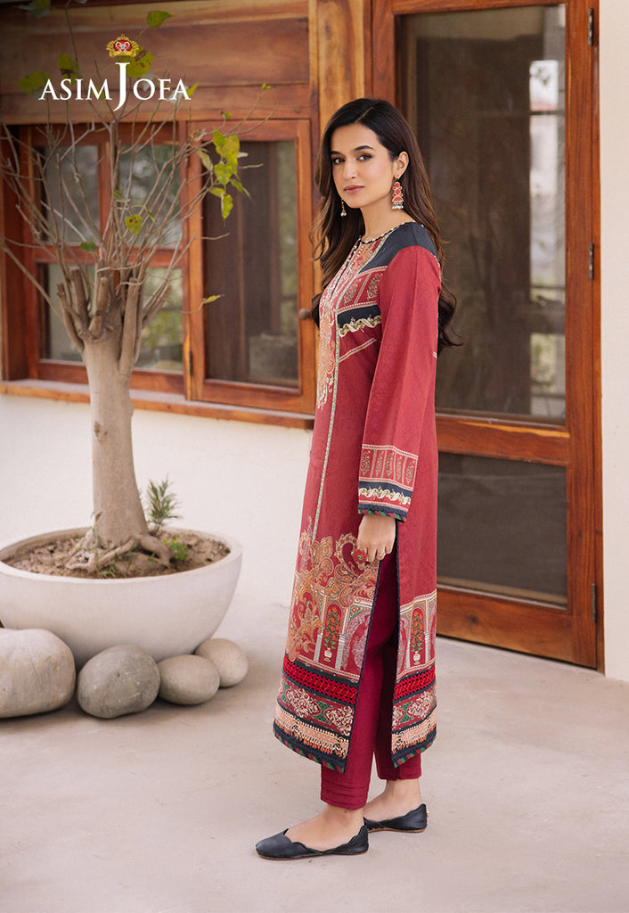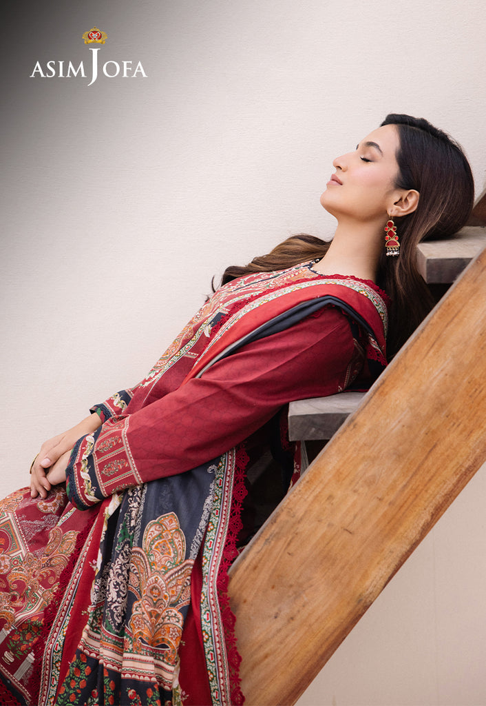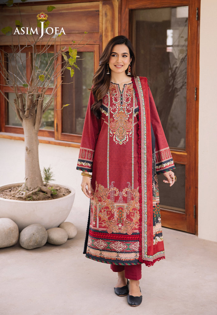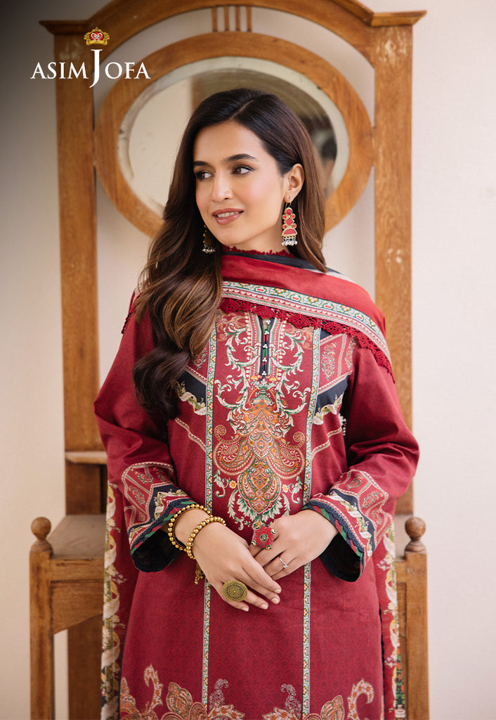 Elevate your style with “Asim Jofa Prints” in our traditional tapestry ensemble where dark red meets intricate prints and motifs. The digitally printed fabric showcases a blend of floral and geometric designs, meticulously crafted to create a tapestry of tradition and artistry. This ensemble is a nod to the grandeur of traditional attire, perfect for adding a touch of regal charm to your wardrobe.