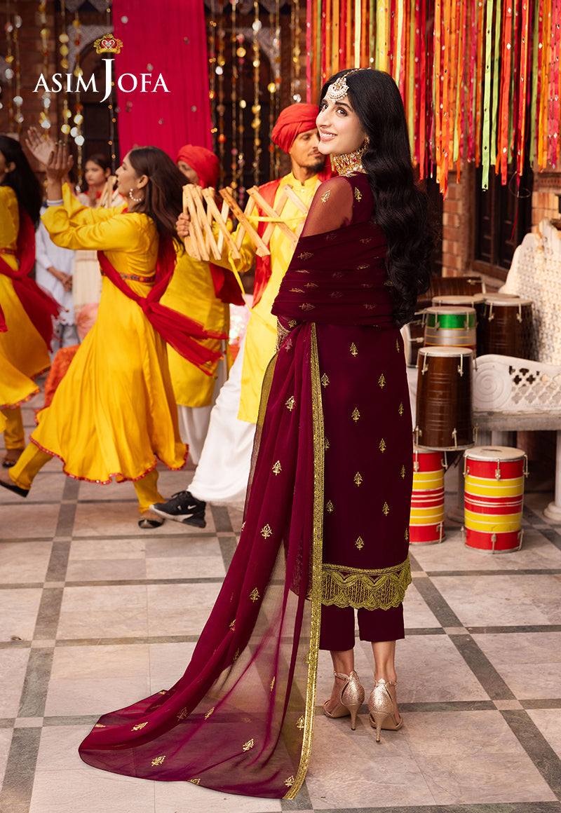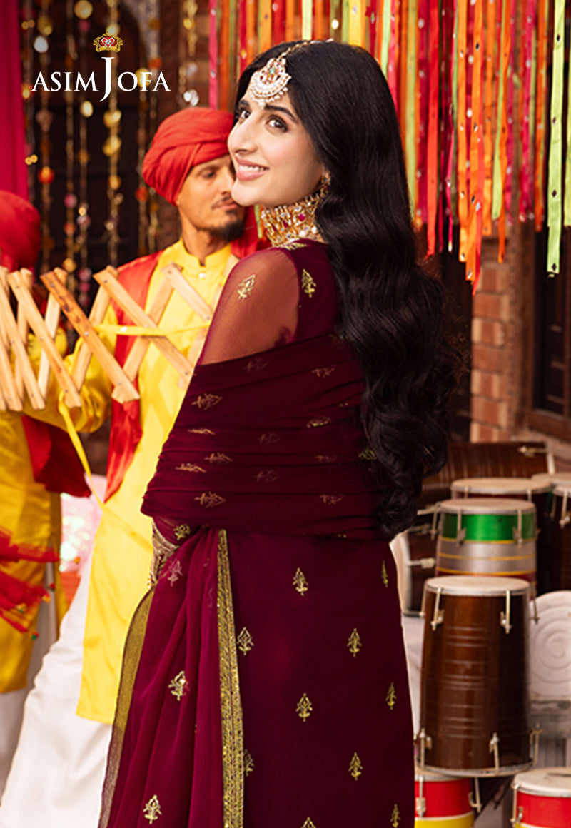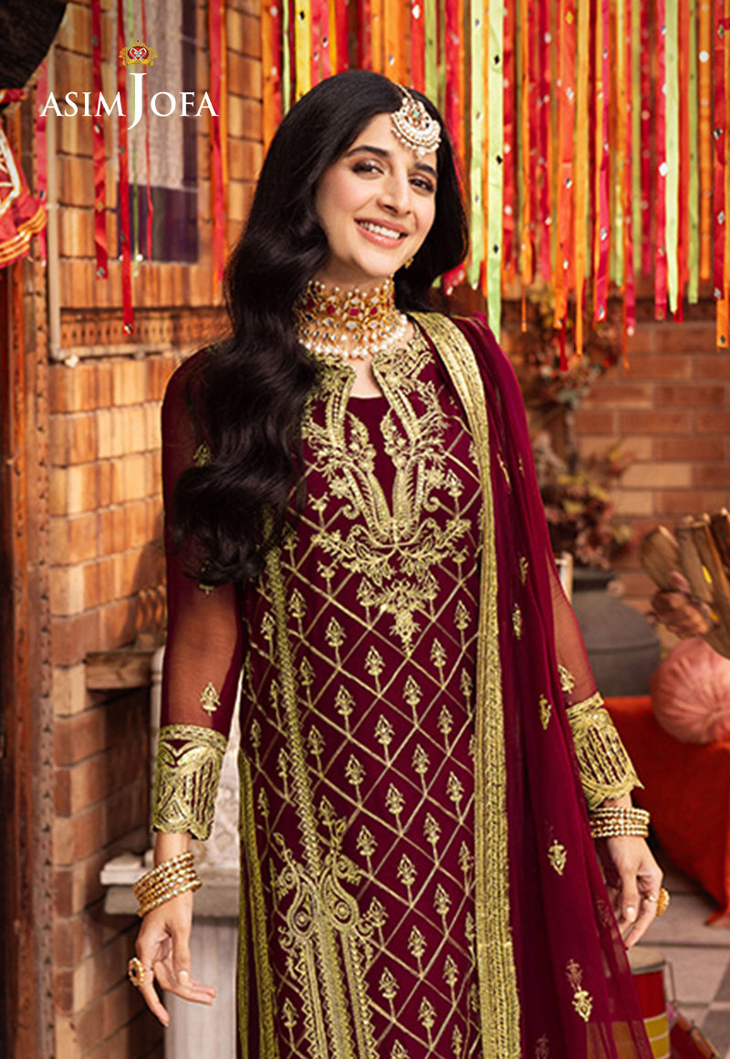 Indulge in the majesty of magenta with “Chamak Damak” collection. This magenta number is a captivating creation adorned with the timeless elegance of Mughal elements and contemporary motifs meticulously embroidered across the shirt. Enhanced with the opulence of gold zari and the shimmering allure of gold sequins, this ensemble is a celebration of tradition and style. The embroidered front center and side panels along with the intricately designed back showcase a symphony of craftsmanship and regality. With embroidered sleeves hemline as well as a chaak border every detail adds to its regal charm. Paired with an embroidered dupatta, it's a tribute to timeless beauty and grace.