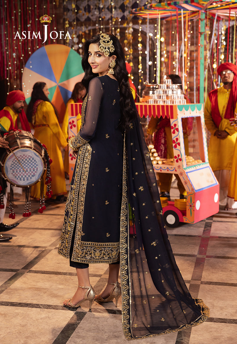 Embark on a journey of elegance and allure with our embroidered navy blue ensemble from “Chamak Damak” collection. This ensemble captivates with its deep navy hue and luminous embroidery. The 3mm gold sequins and gold zari threadwork dance across the fabric casting a spell of enchantment. With each stitch a tale of grace and sophistication unfolds while the embroidered chaak symbolizes the swirling currents of mystery. Draped in the embroidered dupatta, you embody the essence of timeless beauty and understated glamour ready to enchant all who behold you.