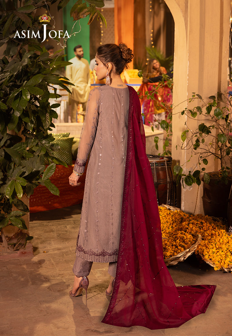Imagine the first light of dawn kissing the sky casting a soft glow on a canvas of dove gray. The glimmering 5 mm silver sequins like stars in the morning sky adorn the neckline and borders with celestial charm. The embroidery woven with plum and dove gray threadwork captures the essence of dawn's embrace. Paired with a plum dupatta, this ensemble is a testament to the beauty of new beginnings designed for those who seek to embrace the day with grace and elegance.