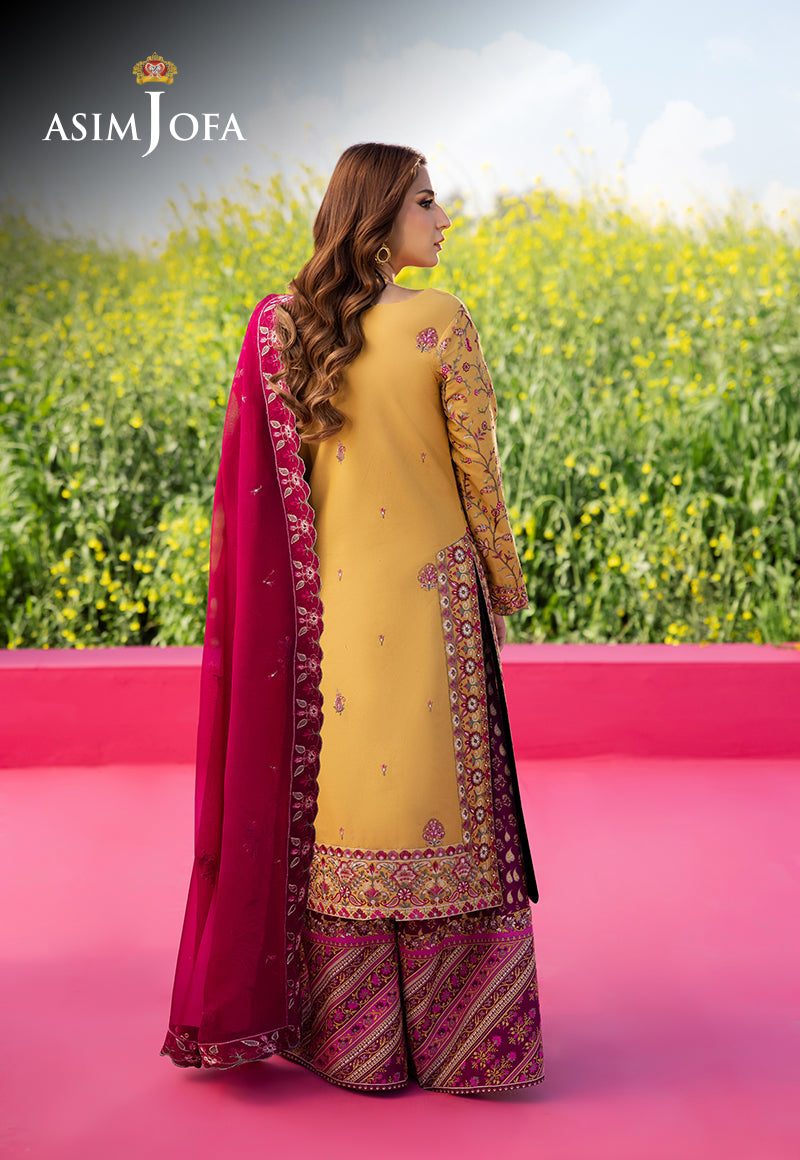 Like the golden glow of an autumn sunset, this marigold ensemble exudes warmth and opulence, a tribute to nature’s most enchanting season. The sun-kissed shirt, bathed in a soft, luminous hue, reflects the amber brilliance of a flourishing garden, adorned with breathtaking floral embroidery in magenta, salmon pink, beige, and fuchsia threads. Paired with a contrasting embroidered dupatta and a beautifully printed trouser, this ensemble paints a tale of transformation, where nature’s colors are at their most vibrant, alive with beauty and grace.