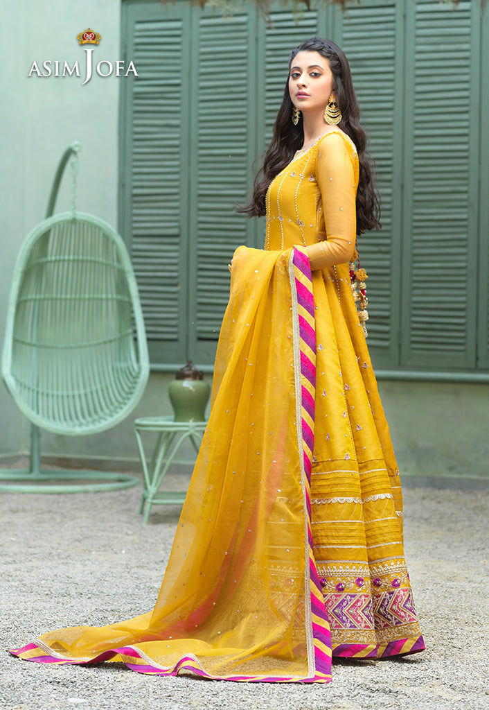 Aglow in this magnificent kalidaar Sabeena truly makes one skip a beat. Intricate booties scattered on mustard gold organza topped with colorful embroidered border worked in chevron pattern inserted with filigree threadwork in shades of aubergine and shocking pink highlighted by touches of golden zari and sequins. A same hued embellished dupatta with dyed cotton silk trouser completes this design.