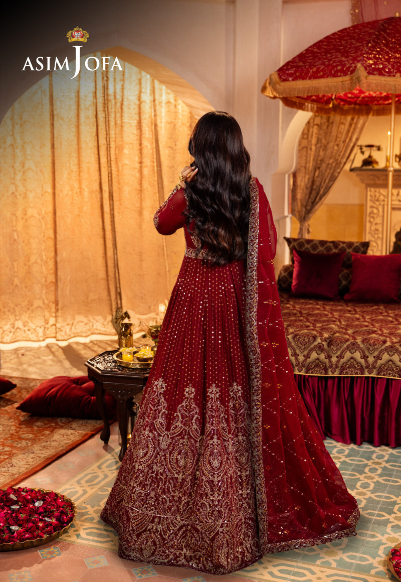 Behold the allure of timeless elegance with this peshwas from Asim Jofa's "Jaan-e-Jahan Chiffon Collection" a masterpiece of intricate craftsmanship. Like a canvas painted with rust red hues and golden threads, this dress tells a story of traditions. Its mesmerizing patterns inspired by ancient floral and geometric motifs dances like whispers of bygone eras. The gold and silver zari-work enriched with blinging 5mm gold sequins & 3 mm cupped silver sequins add a touch of regal grandeur creating a harmonious contrast that captivates the eye. Fit for royal occasions and cultural celebrations, this dress embodies the essence of tradition and beauty.