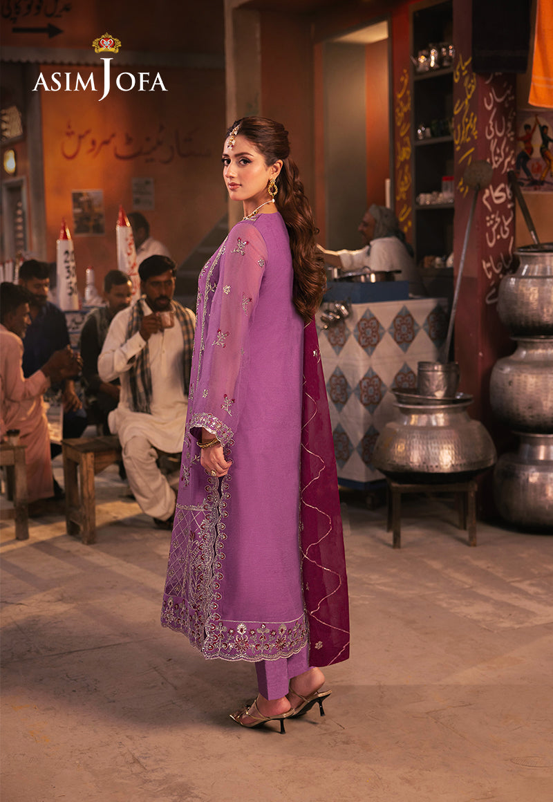 Emerge a vision of twilight royalty in this mesmerizing amethyst masterpiece. The embroidered shirt is a dream, its all-over shimmer reminiscent of moonlight on dew-kissed petals. Deep magenta and pale green threads intertwine like a blossoming garden, accented by rose gold zari and artfully dispersed sequins that shimmer like fallen stardust, adding a touch of ethereal luminescence. Paired with an embroidered dupatta in a stunning pattern, mirroring the beauty of a blooming night, this ensemble becomes a flawless tapestry woven from the dreams of twilight.