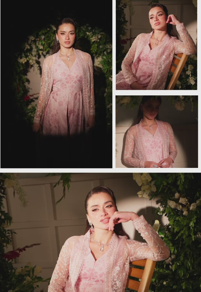 Radiating contemporary charm, this blush pink ensemble brings a fresh perspective to modern elegance. The organza cape is beautifully embroidered with silver zari and sequins, highlighted with intricate off-white threadwork that shimmers with finesse. Beneath it lies a chic jumpsuit crafted from printed silk, blooming with a delicate ombre floral print that adds depth and artistry to the look. Versatile in its appeal, this outfit offers two to three styling options, allowing it to transform seamlessly with your personal choices while retaining its refined allure.