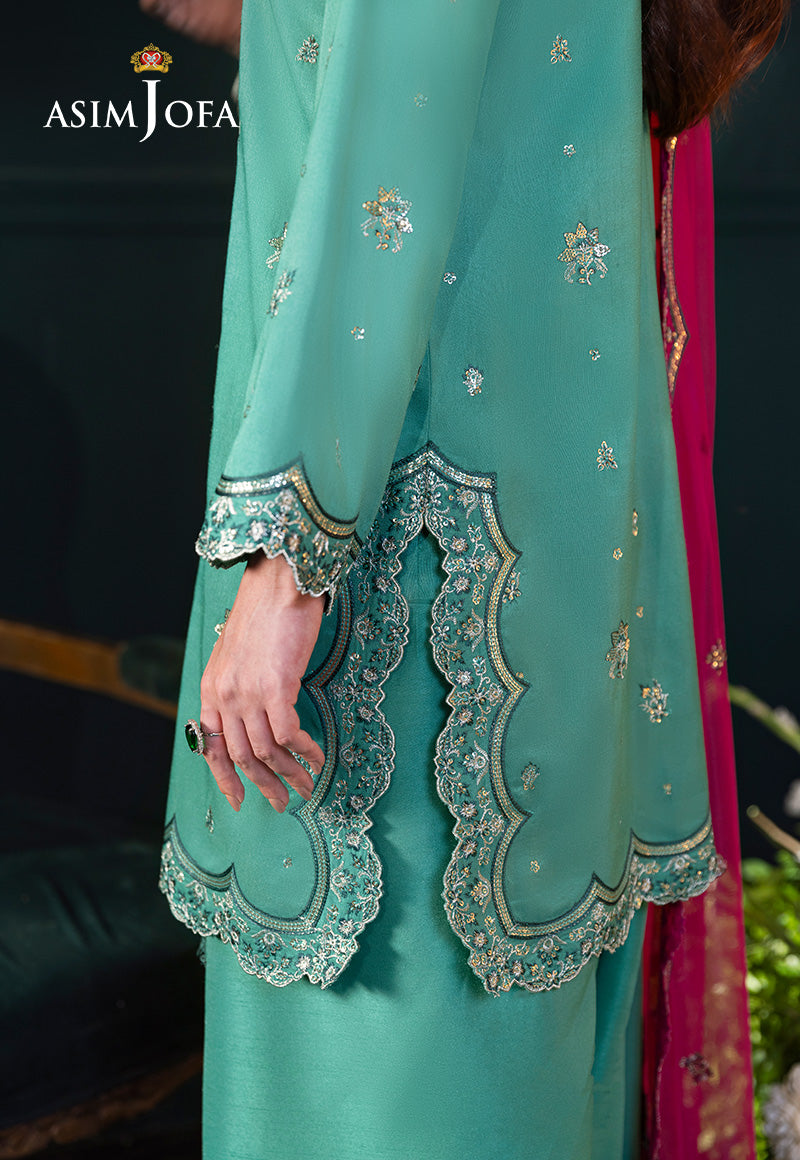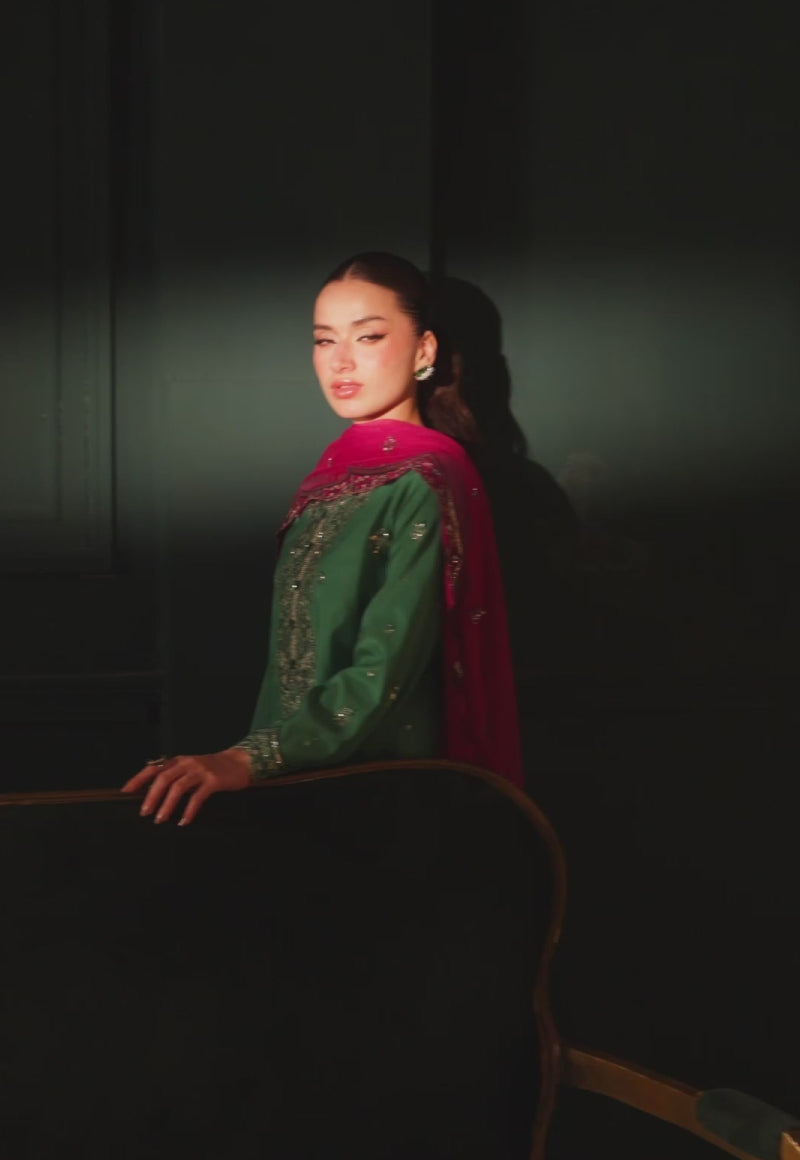 Rich and regal, this emerald green ensemble is crafted from raw silk to embody timeless sophistication. The shirt is adorned with front and back necklines, scalloped chaak, and borders, intricately embroidered with light gold zari and sequins that glimmer with understated grandeur. Deep teal threadwork adds depth and dimension, enhancing the richness of the shade. Completing the look is a contrasting dupatta, decorated with scalloped embroidery along all sides and delicate chann scattered across the fabric, creating a harmonious balance of tradition and elegance.