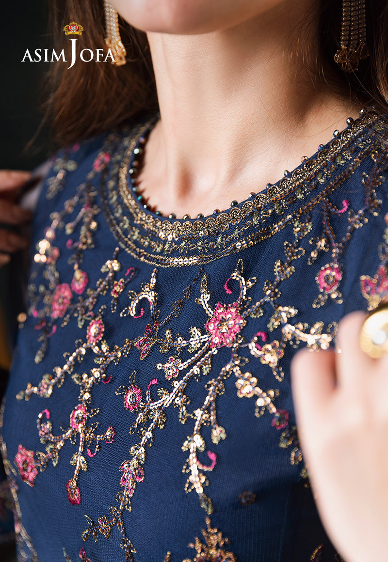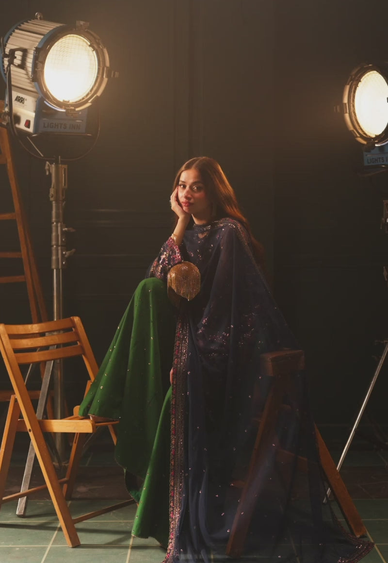 A striking play of colors defines this ensemble, where a deep blue shirt takes center stage with exquisite embroidery in shades of shocking pink and soft pink threadwork. Light gold sequins and antique gold two-toned zari add a luminous touch, creating a captivating contrast against the bold base. Paired with green bottoms adorned with delicate chann embroidery that lend a graceful flare, the look is completed with a minimally embroidered dupatta for a perfectly balanced finish. This composition embodies vibrancy with refined elegance.