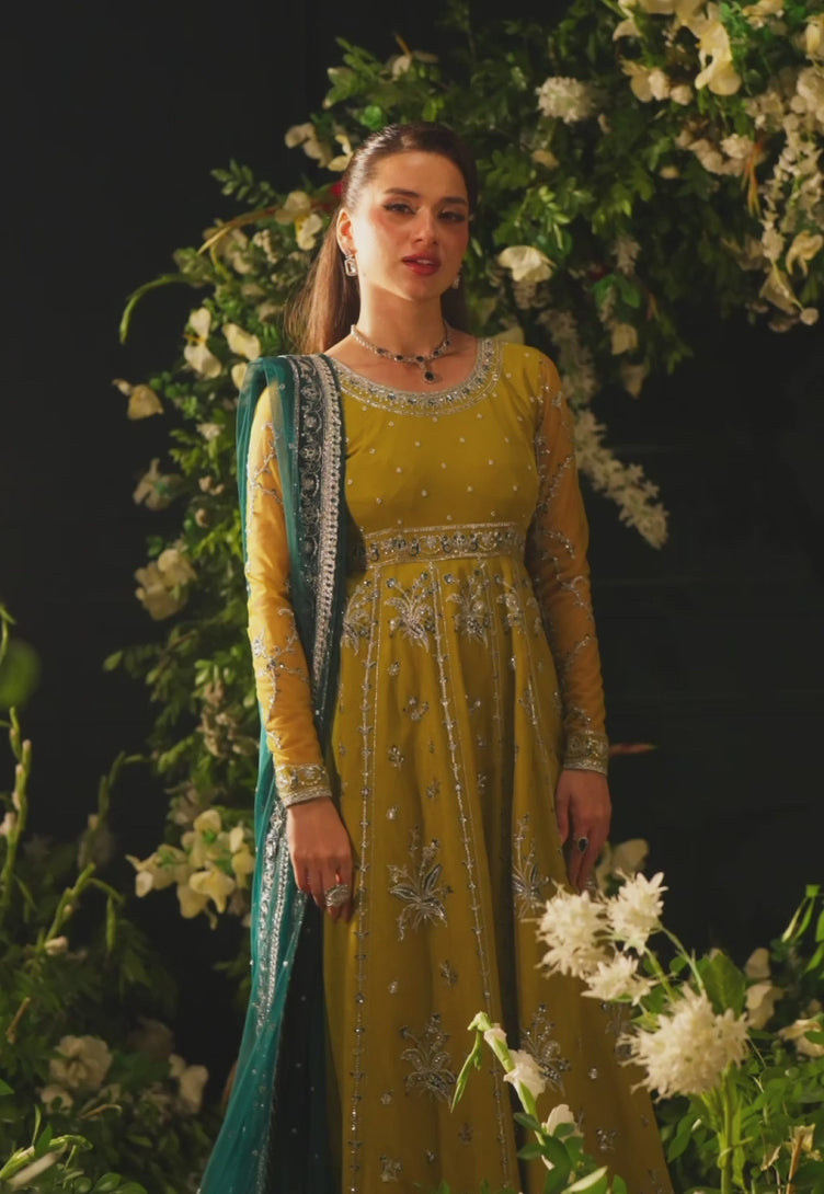 Refreshing and radiant, this lime green kalidaar is a celebration of graceful movement and charm. Embroidered with silver sequins and zari, it shimmers with subtle brilliance, while delicate hints of teal threadwork add depth and contrast. Ten intricately crafted kalis lend volume and a flowing flare that captures the eye with every step. Paired with a minimally embroidered dupatta and plain trousers in a striking teal green contrast, this ensemble embodies a perfect harmony of vibrancy and elegance.