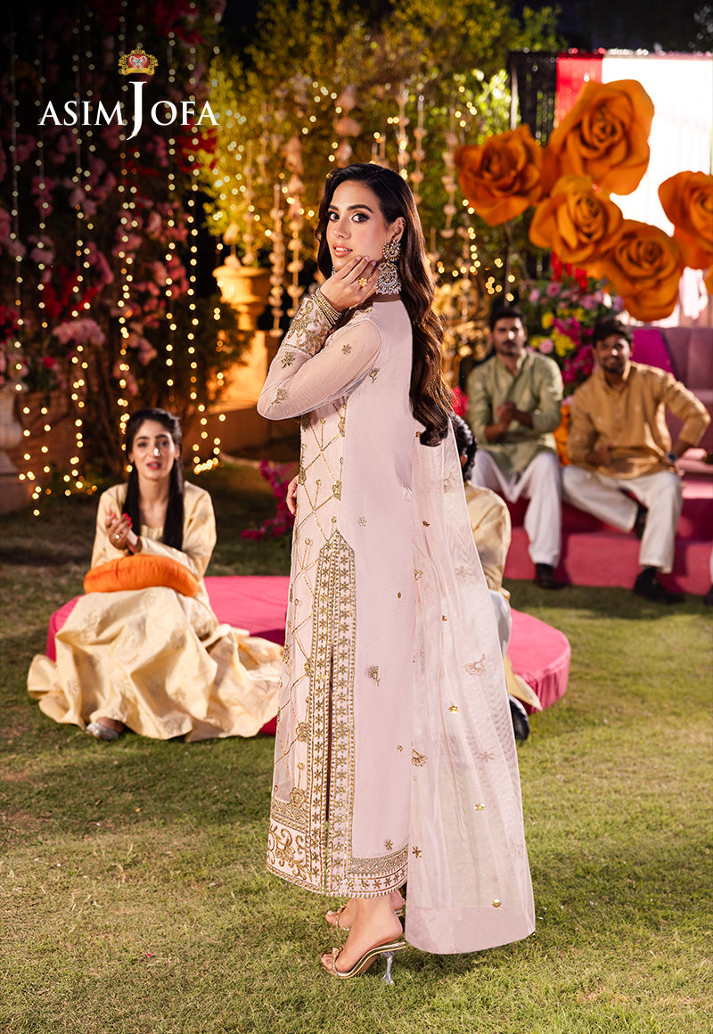 Embrace the new day with this light peach number from Asim Jofa’s “Jag Mag Collection.” This creation is kissed by the morning light featuring delicate gold zariwork and 3mm sequins that reflect the joy of dawn. The grand neckline and the all-over shirt embroidery are a symphony of design while the grand borders and embroidered dupatta complete the outfit designed to make you shine at every festivity.