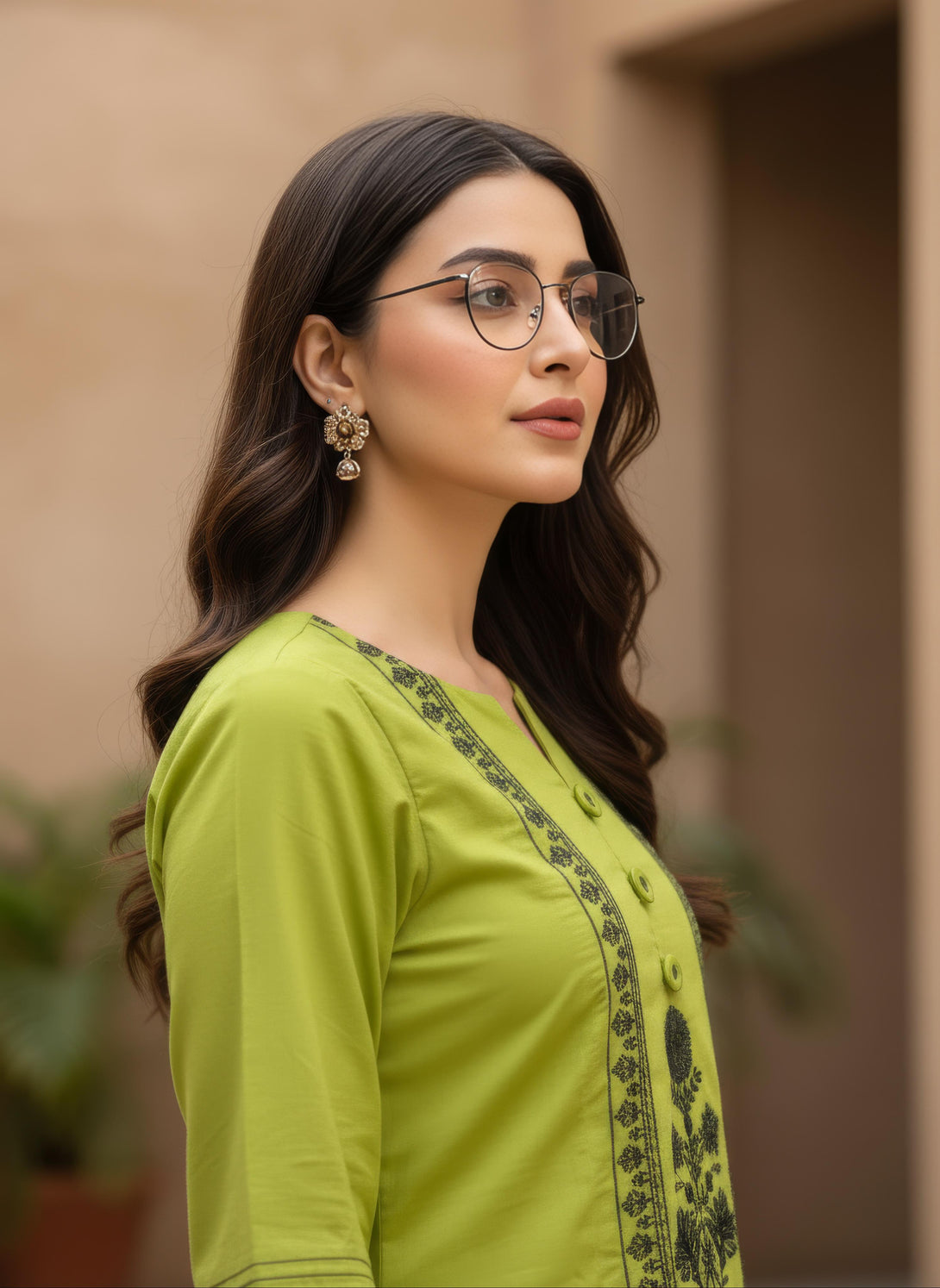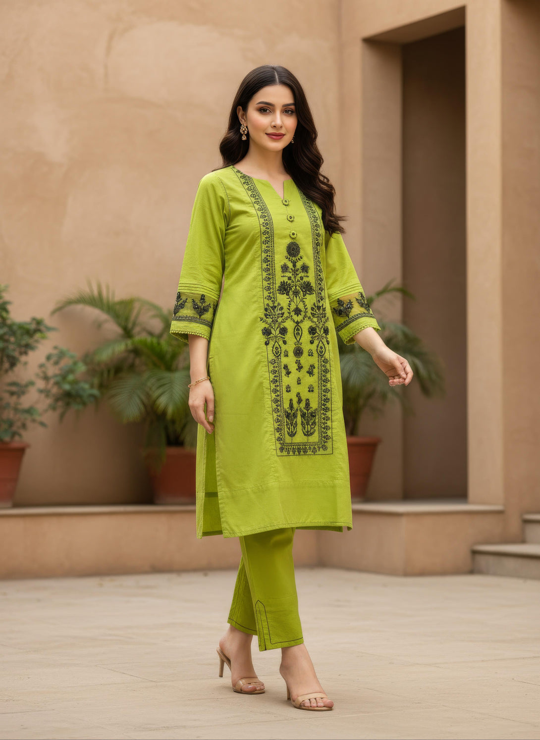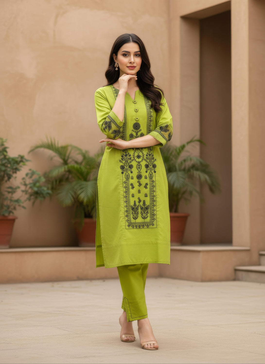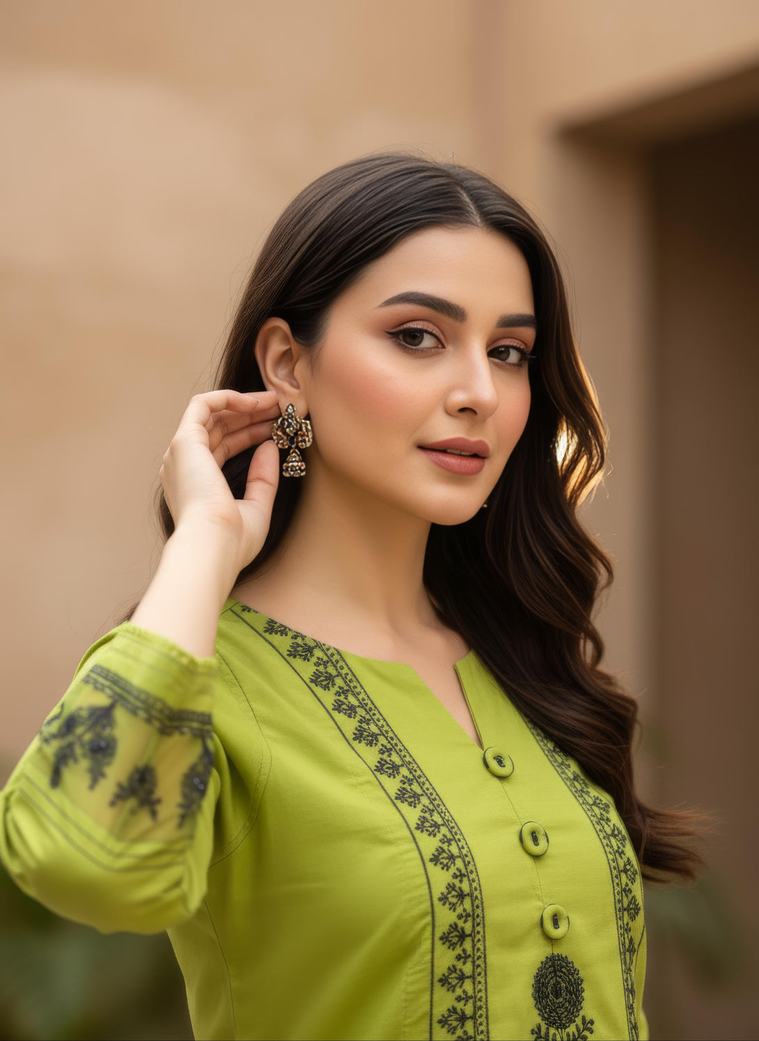 Soft yet striking, this green ensemble exhibits contemporary elegance. The shirt is beautifully embroidered with delicate leaf motifs, creating a harmonious natural vibe, while the stunning neckline, adorned with lace detailing, adds a touch of sophistication. The sleeves are enhanced with exquisite embroidery along the borders, elevating the overall design. Paired with stylish trousers that complement the outfit’s refined look, this ensemble is a perfect expression of modern femininity and timeless charm.