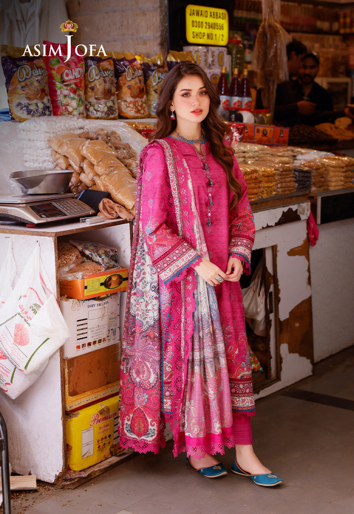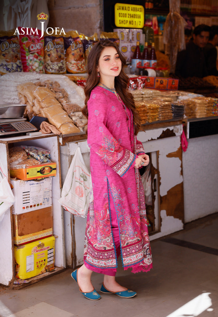 Infuse your summer style with the exquisite elegance of Asim Jofa’s “Arabic Lawn Collection”! This deep magenta outfit is decorated with delicate floral and paisley motifs in tones of blue and white. The printed neckline and sleeves add a touch of refined elegance making this ensemble perfect for any occasion. The outfit is paired with a beautifully designed dupatta showcasing a harmonious blend of traditional patterns in complementary shades of magenta and white. Elevate your summer wardrobe with this timeless beauty.