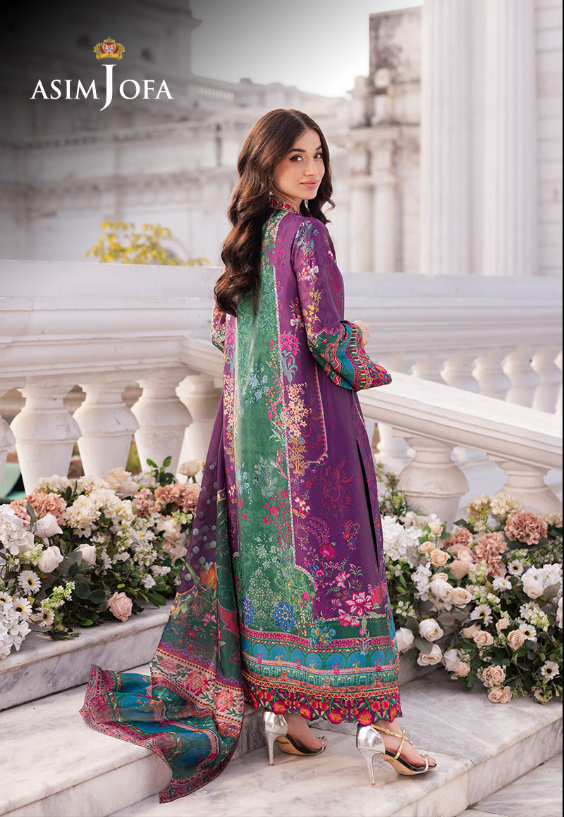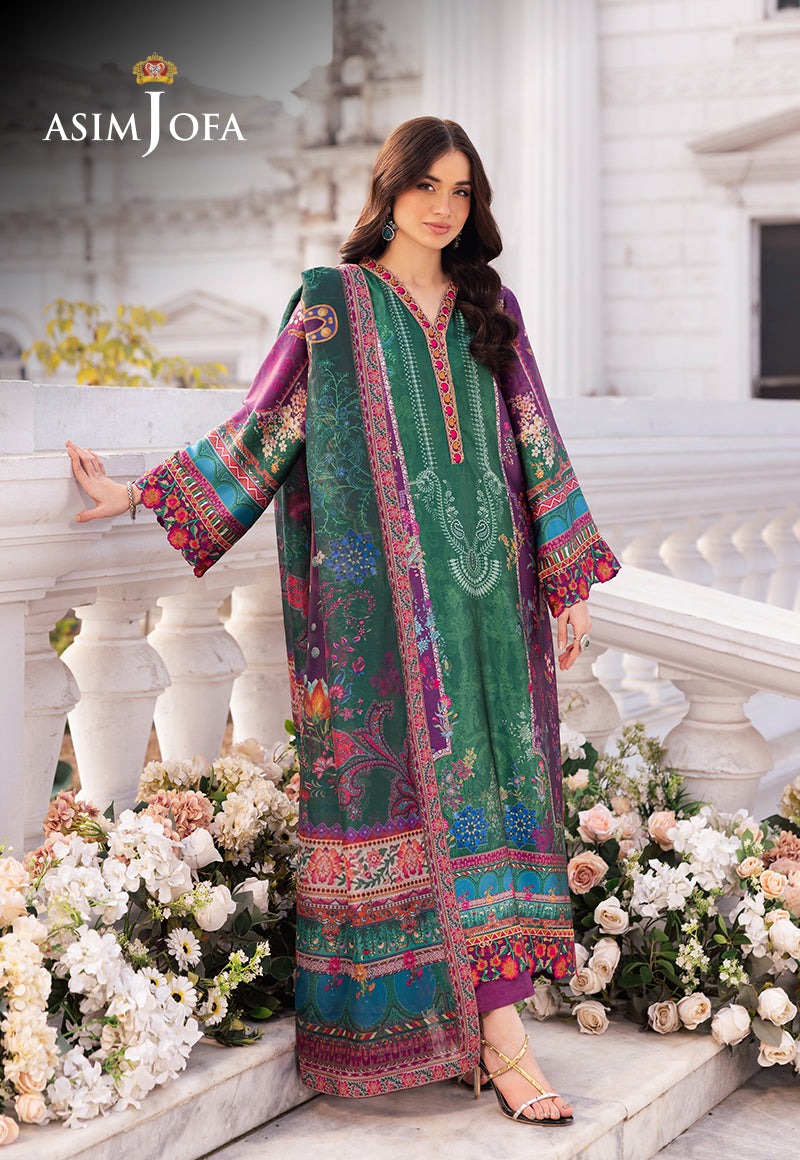 The essence of traditional prints radiates through this striking olive green and magenta ensemble, where unique design bloom like a garden blessed with colors. The digitally printed shirt features a delicately embroidered neckline capturing the heart of floral elegance, while the sleeves and borders, adorned with intricate embroidery, add layers of grandeur. Complemented by a flowing digitally printed silk dupatta that drapes like a poetic breeze, this ensemble effortlessly transitions between formal grace and casual allure, making it a statement of undeniable beauty.