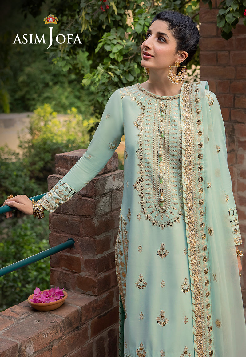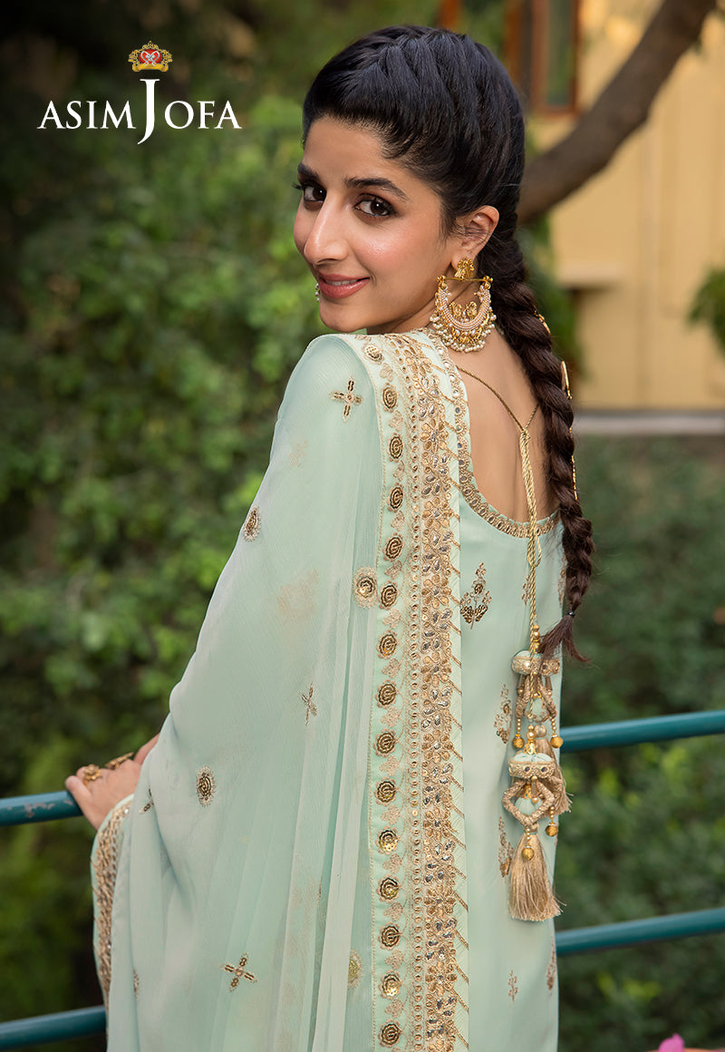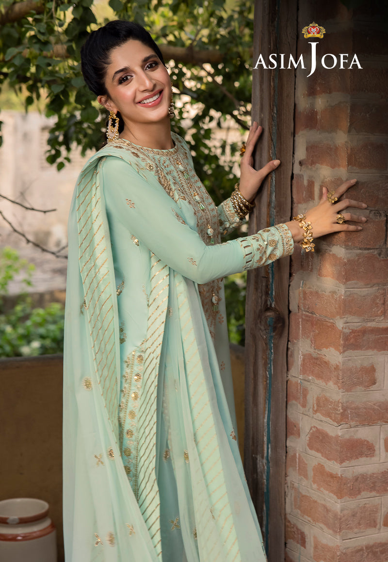 Asim Jofa's "Shadow Work" collection unfurls a narrative of elegance, and Mawra Hocane becomes the embodiment of a mint-hued reverie. An ensemble that speaks to regal grace, this creation is akin to a carefully curated gallery of intricate aesthetics. Ivory threadwork graces the canvas like whispers of history, while antique gold sequins glint like rays of forgotten suns. The shirt is an opulent panorama, each art nouveau motif a chapter in the tale of nature's beauty. The chiffon dupatta flutters like a gossamer-winged muse, painting the air with dreams yet to be told.