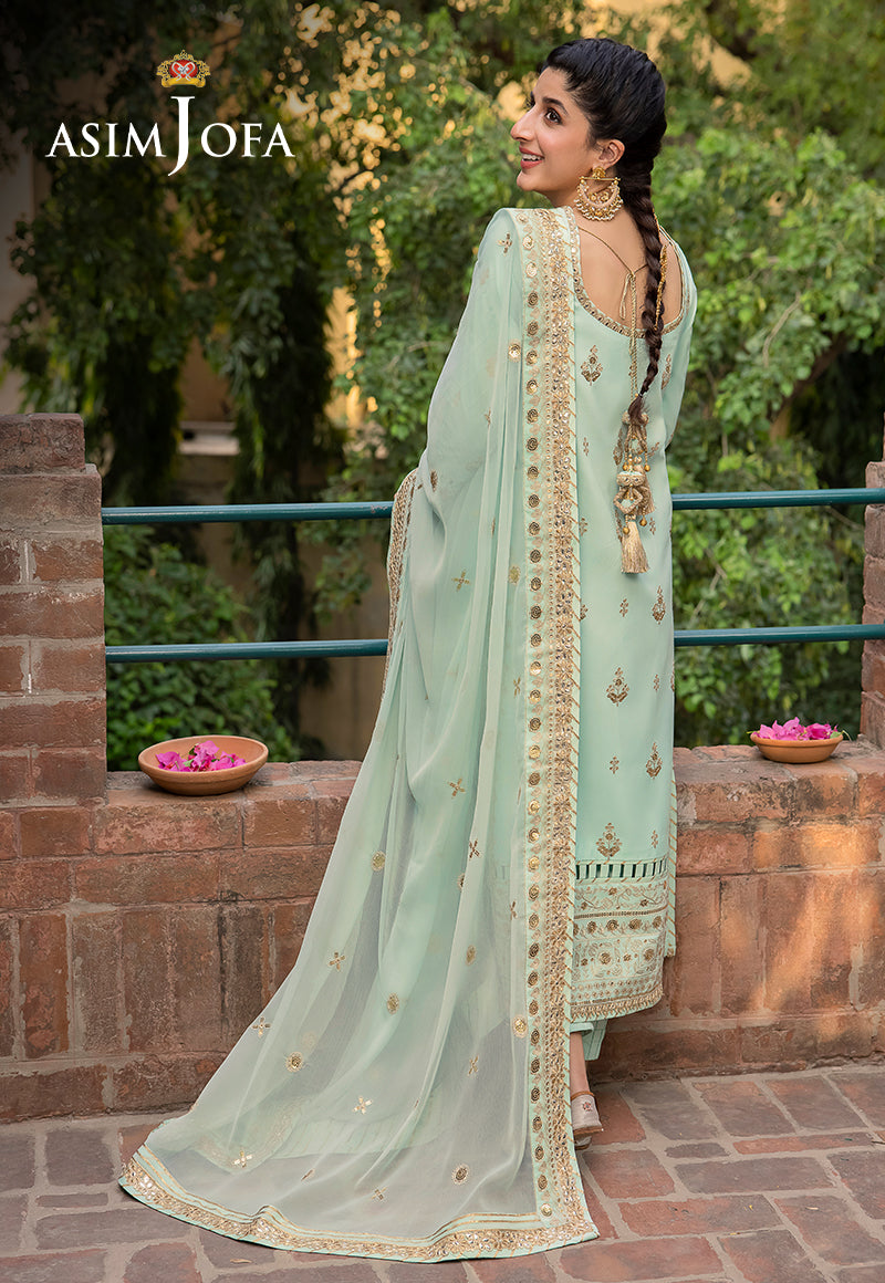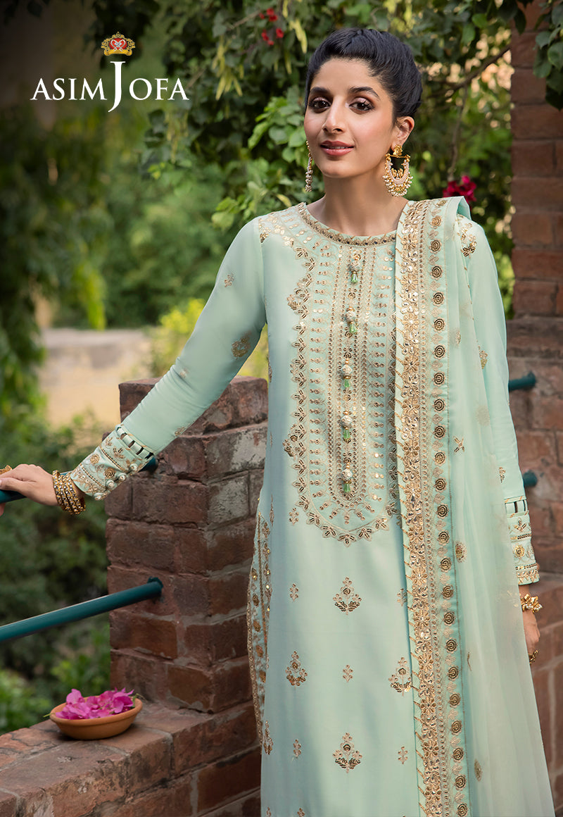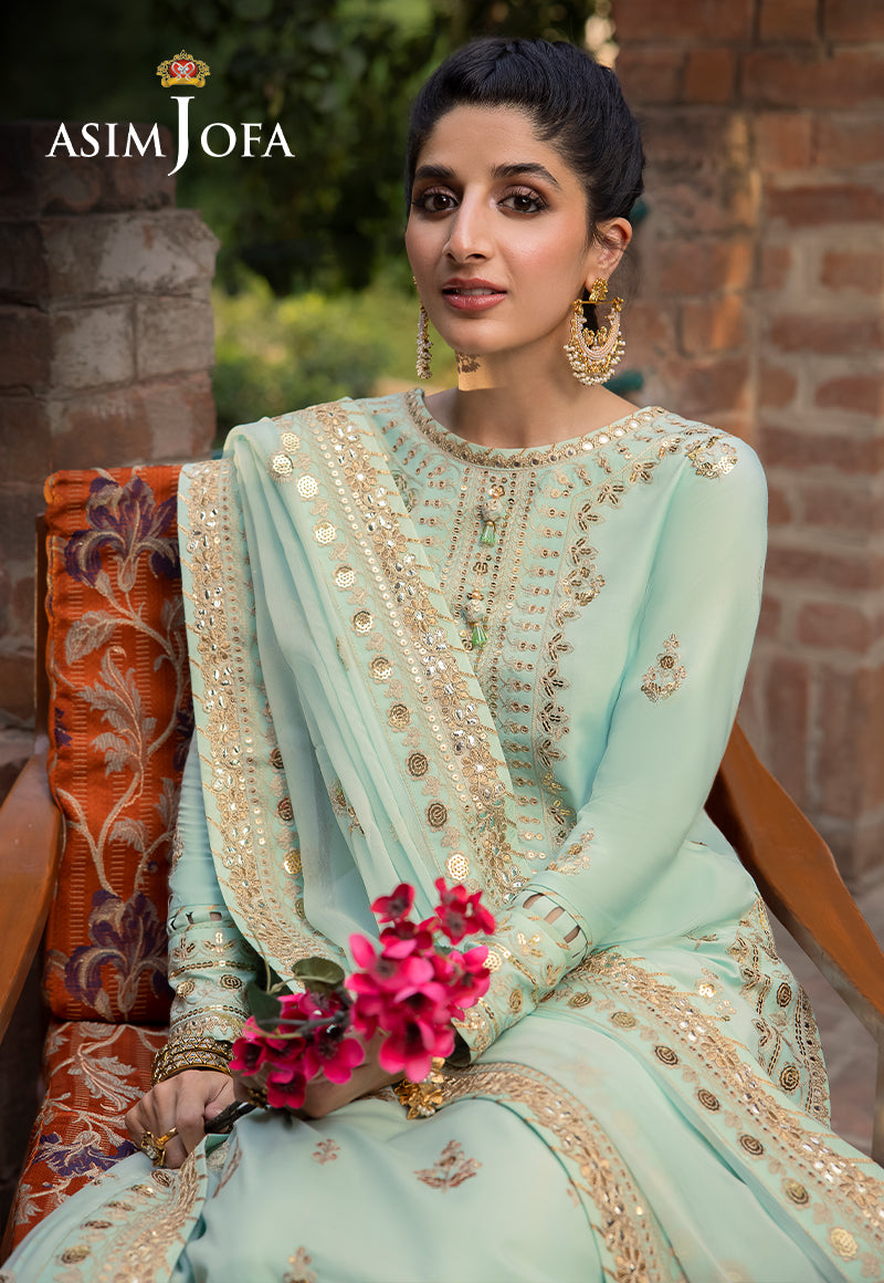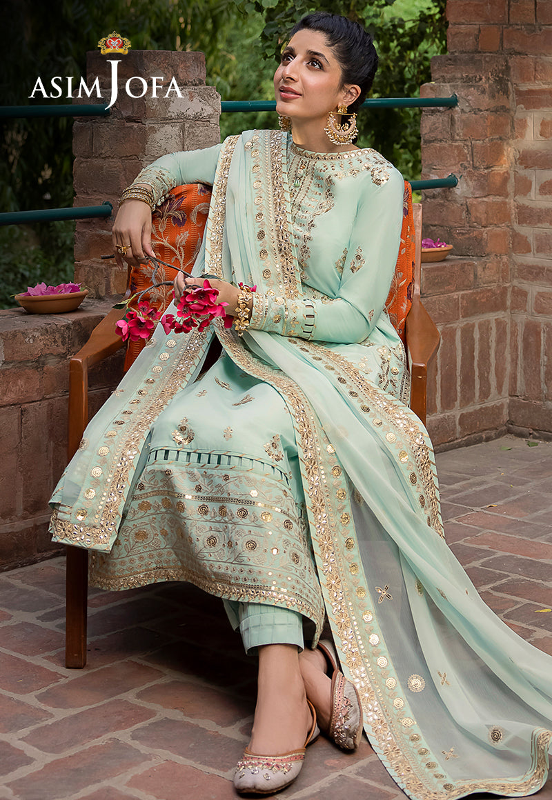 Asim Jofa's "Shadow Work" collection unfurls a narrative of elegance, and Mawra Hocane becomes the embodiment of a mint-hued reverie. An ensemble that speaks to regal grace, this creation is akin to a carefully curated gallery of intricate aesthetics. Ivory threadwork graces the canvas like whispers of history, while antique gold sequins glint like rays of forgotten suns. The shirt is an opulent panorama, each art nouveau motif a chapter in the tale of nature's beauty. The chiffon dupatta flutters like a gossamer-winged muse, painting the air with dreams yet to be told.